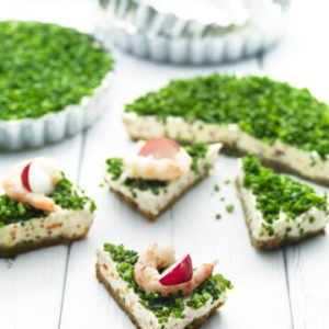 - När fyllningen har stelnat, lyft försiktigt upp cheesecaken med hjälp av plastfolien. Strö gräslök över pajerna och tryck till lite lätt så att den fastnar.