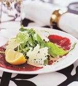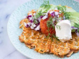 - Rör ihop crème fraiche, philadelphiaost, rödlök, rom, citronskal och citronsaft till en kräm. Smaka av med salt och vitpeppar.