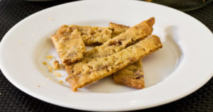 - Dela degen i tre bitar och forma dem till längder, lika långa som plåten. Lägg längderna på en plåt med bakplåtspapper, och platta till dem något. Grädda mitt i ugnen i ca 10 minuter.