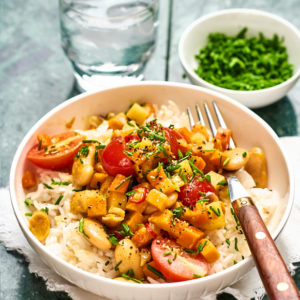 - Skär cocktailtomaterna i halvor.